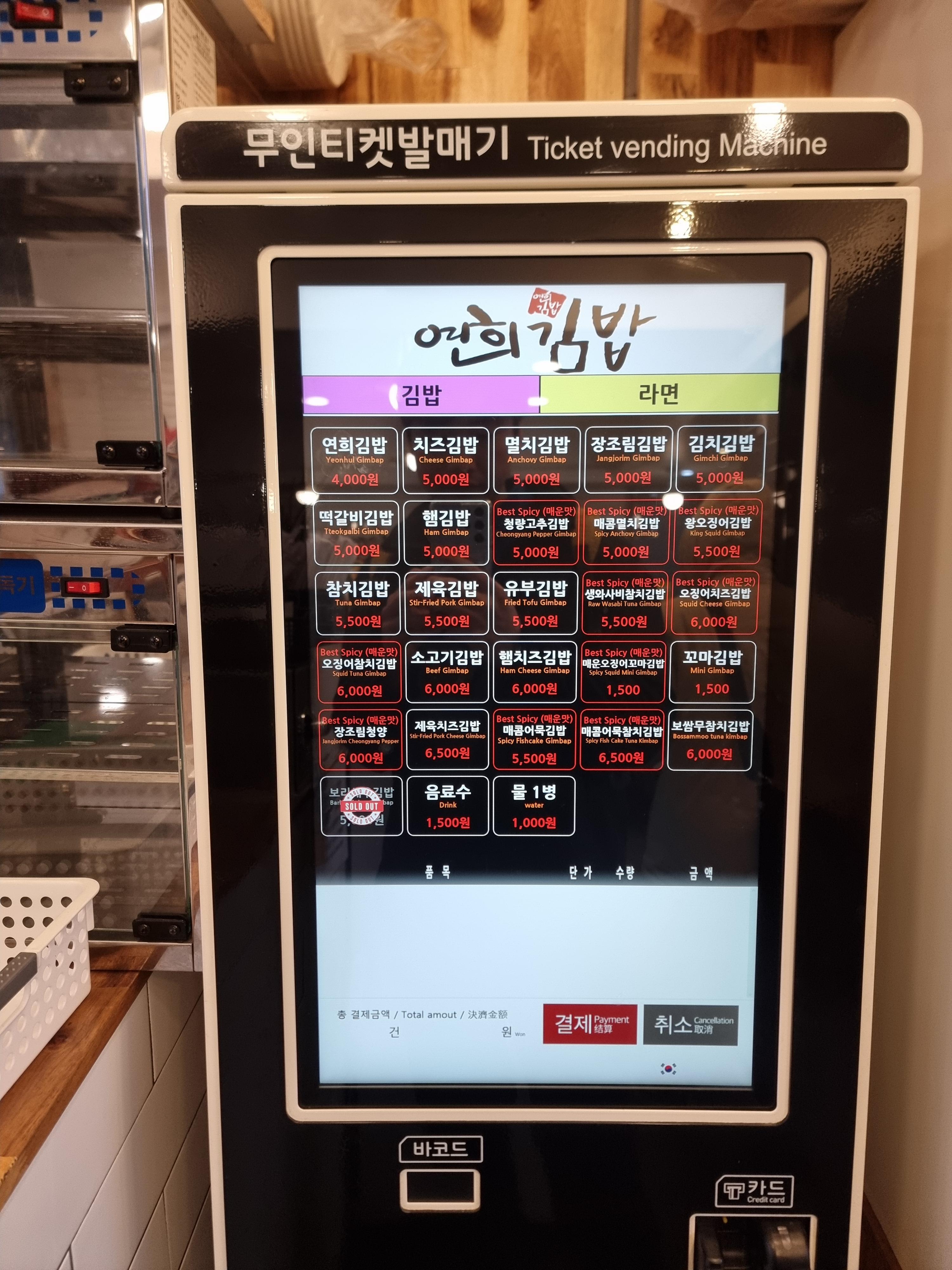 주문은 이렇게 키오스크로 주문하면 됩니다. 김밥 기본 4000원 부터 최대 6000원까지 있습니다. 김밥 가격을 볼때마다 물가가 살발하게 올랐구나하는 생각이 듭니다.